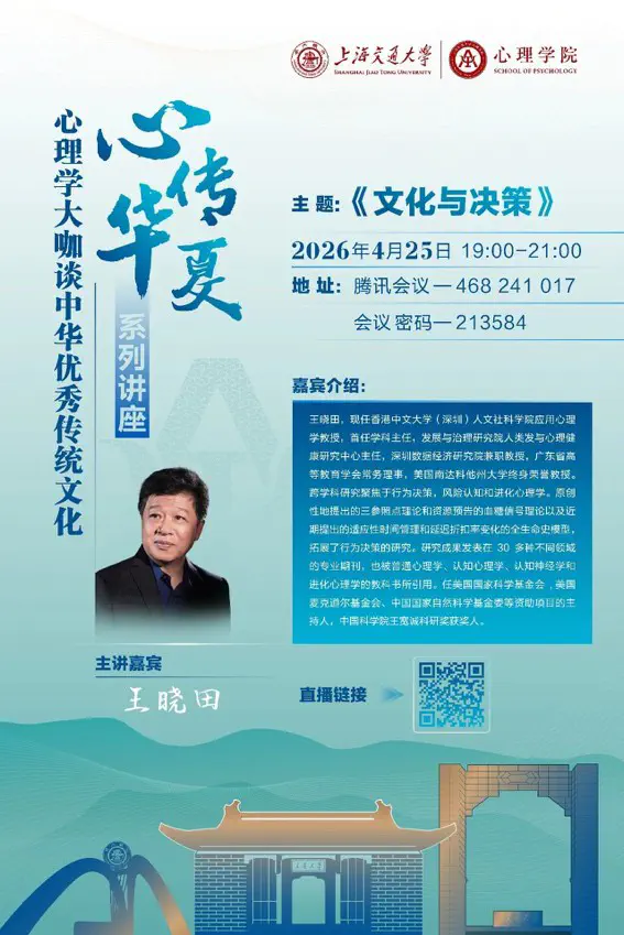 On April 25, 2026, Professor Wang Xiaotian, Professor of the School of Humanities and Social Sciences at The Chinese University of Hong Kong, Shenzhen, and the inaugural discipline head of the Applied Psychology program, was invited to deliver an online special report titled “Culture and Decision-Making” for the “Psych-Spread China” lecture series on excellent traditional Chinese culture, hosted by the School of Psychology at Shanghai Jiao Tong University and the Institute of Chinese Cultural Psychology at Shanghai Jiao Tong University. The lecture was moderated by Professor Zhao Binglei from Shanghai Jiao Tong University, sparking a lively discussion, with over 2,800 participants online.